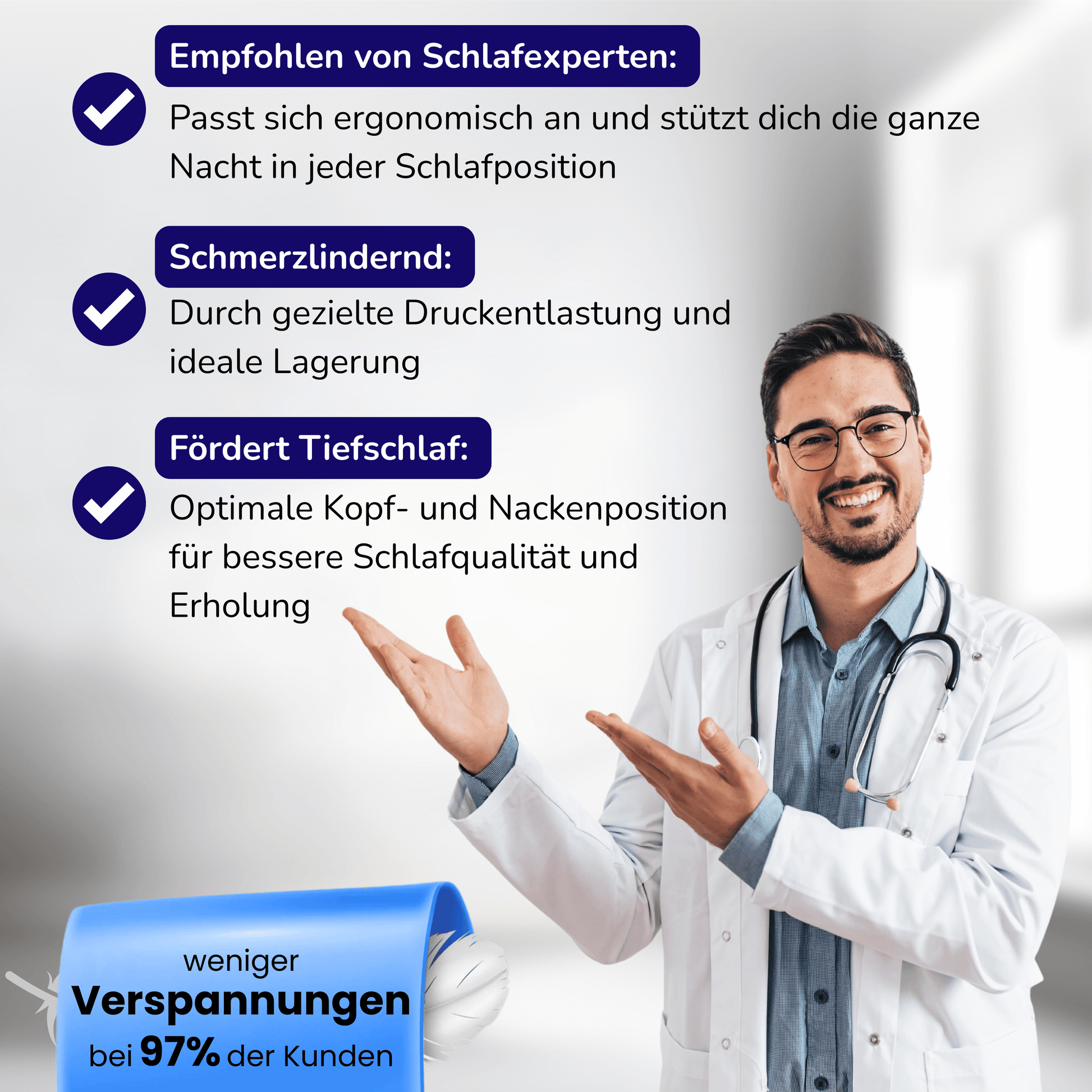 Ja, das ergonomische Design kann Verspannungen in Nacken, Schultern und Rücken reduzieren. Mit der internen Schlafstudie ist das zusätzlich belegt worden.